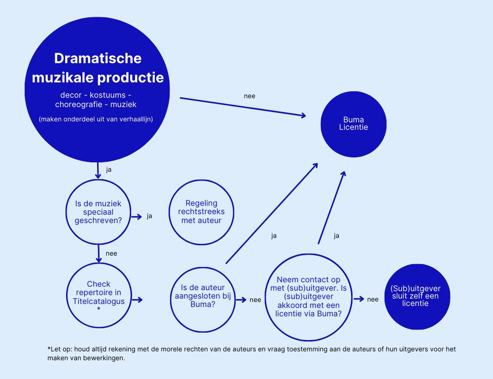 Veel zusterorganisaties van Buma hanteren namelijk een ander beleid, als het gaat om het gebruik van bestaand repertoire in dramatisch muzikale producties. Er zijn zusterorganisaties die net als Buma licentiëren voor bestaand repertoire in een dramatisch muzikale productie. In andere landen ligt het verlenen van toestemming en het bepalen van de hoogte van de vergoeding bij de auteur of de uitgever. Als bestaande muziekwerken van auteurs die aangesloten zijn bij zusterorganisaties van Buma in een dramatisch muzikale productie worden gebruikt, kan Buma het gebruik niet zonder meer licentiëren. Wij adviseren dan ook om voor het gebruik van deze werken tijdig contact op te nemen met de betreffende (sub) uitgevers in Nederland. Wie dat zijn, kun je terugvinden in de Titelcatalogus van BumaStemra.